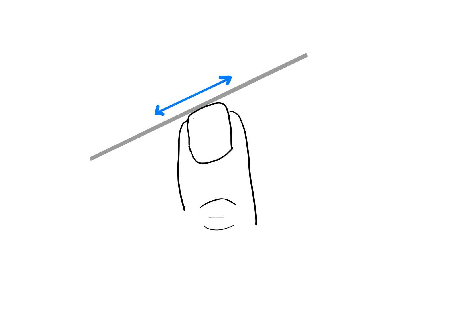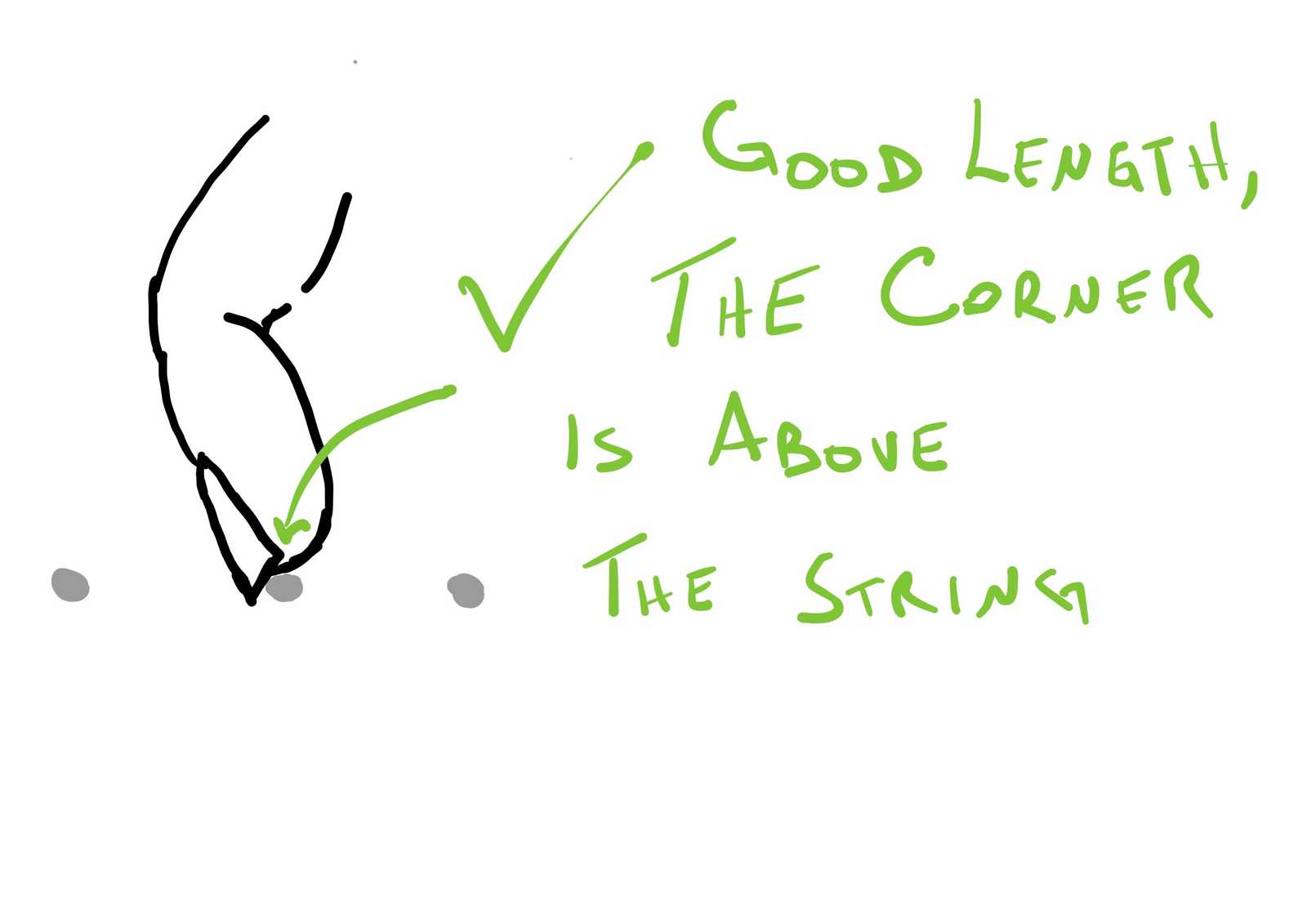 In the example above, fingers A and B have the same angle, and finger C has a flatter angle. As a result, A and B will sound the same, and have a slightly brighter sound, with more resistance. Finger C will have a warmer sound with less resistance.