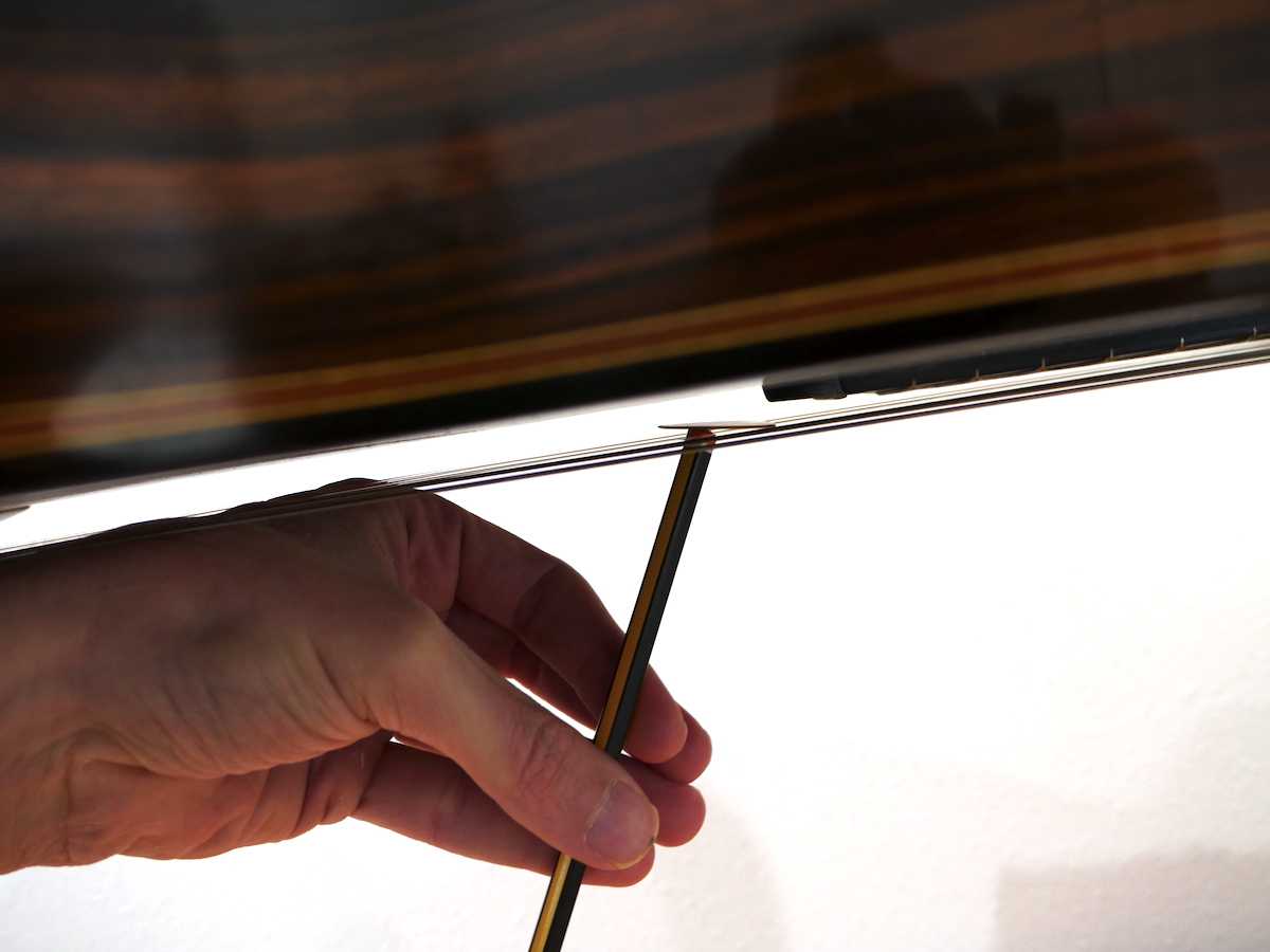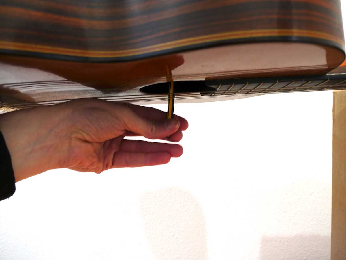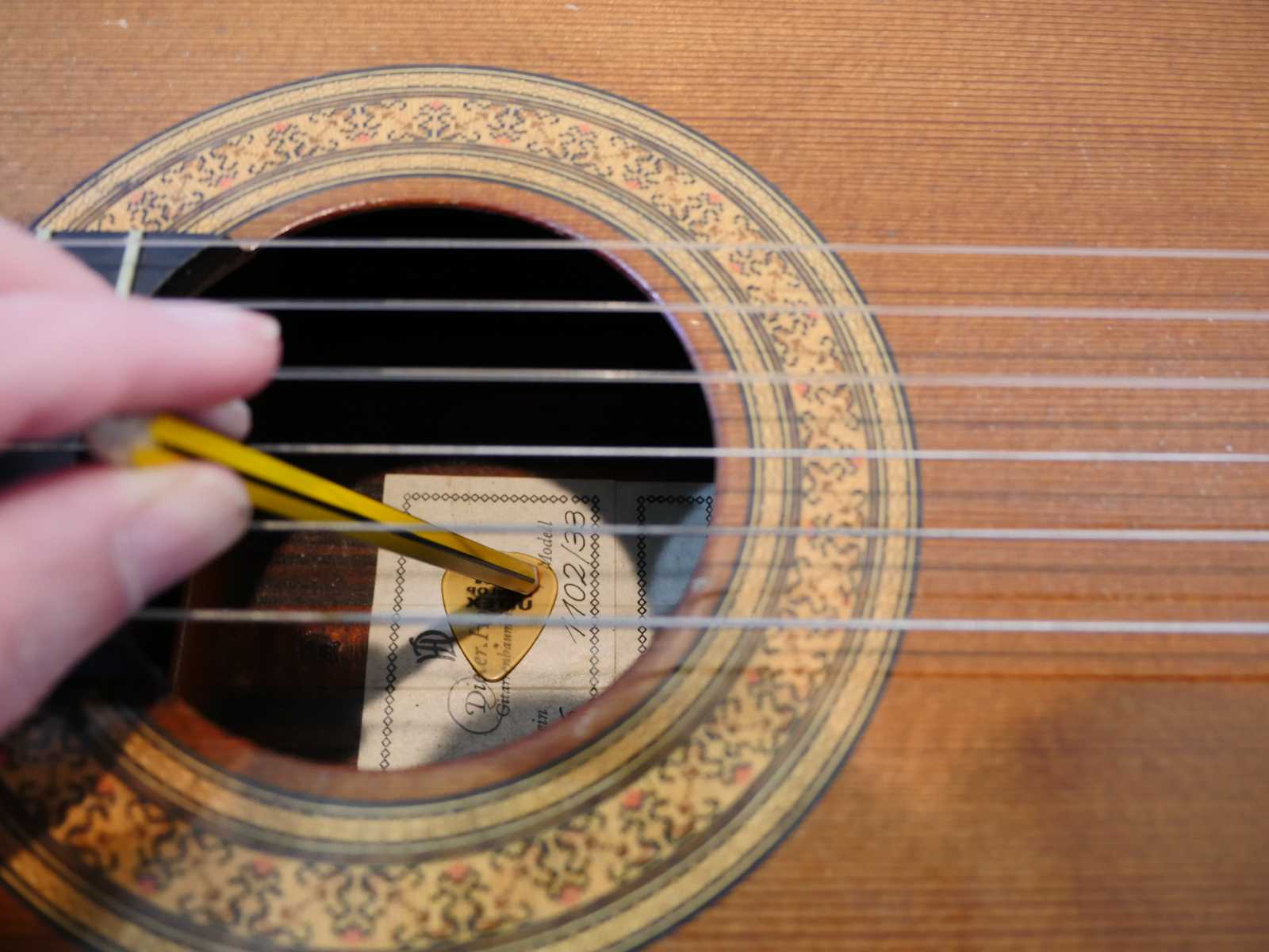 Hold the guitar pick against the back of the guitar with your finger or a pencil. Make sure it is centered in the soundhole.