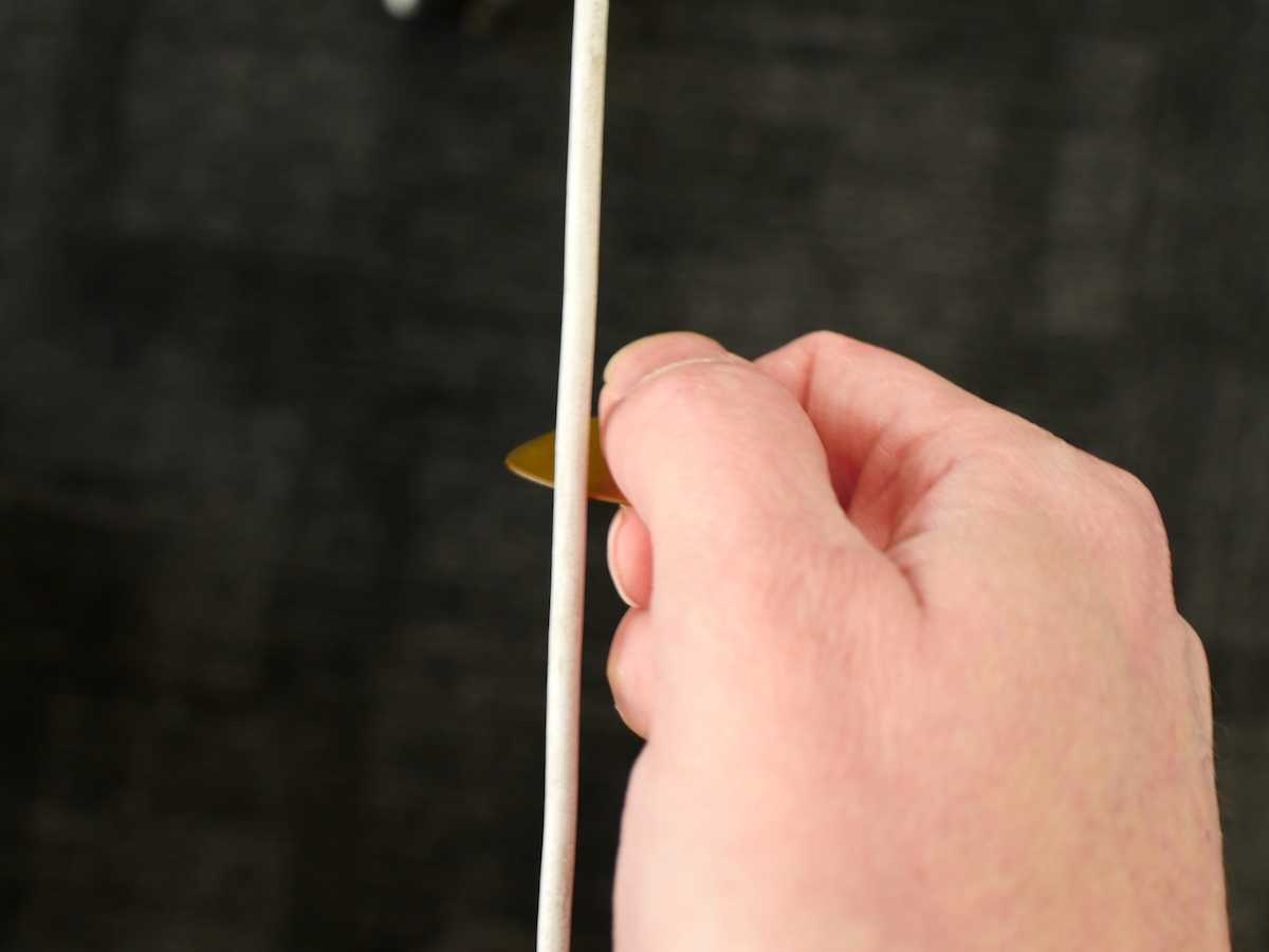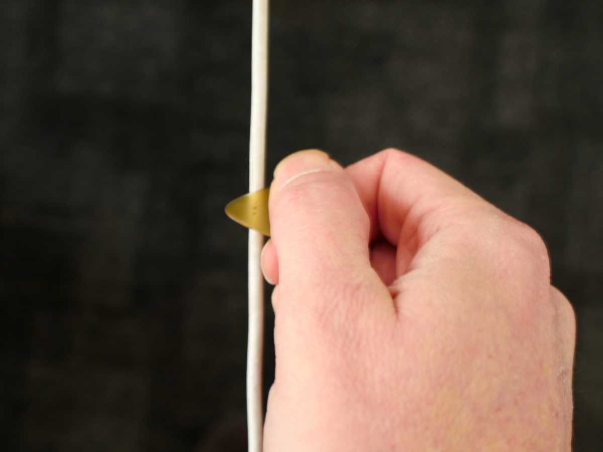 Instead of placing the pick flat onto the strings, rotate it so that the pick’s edge is on the string. See the diagram.